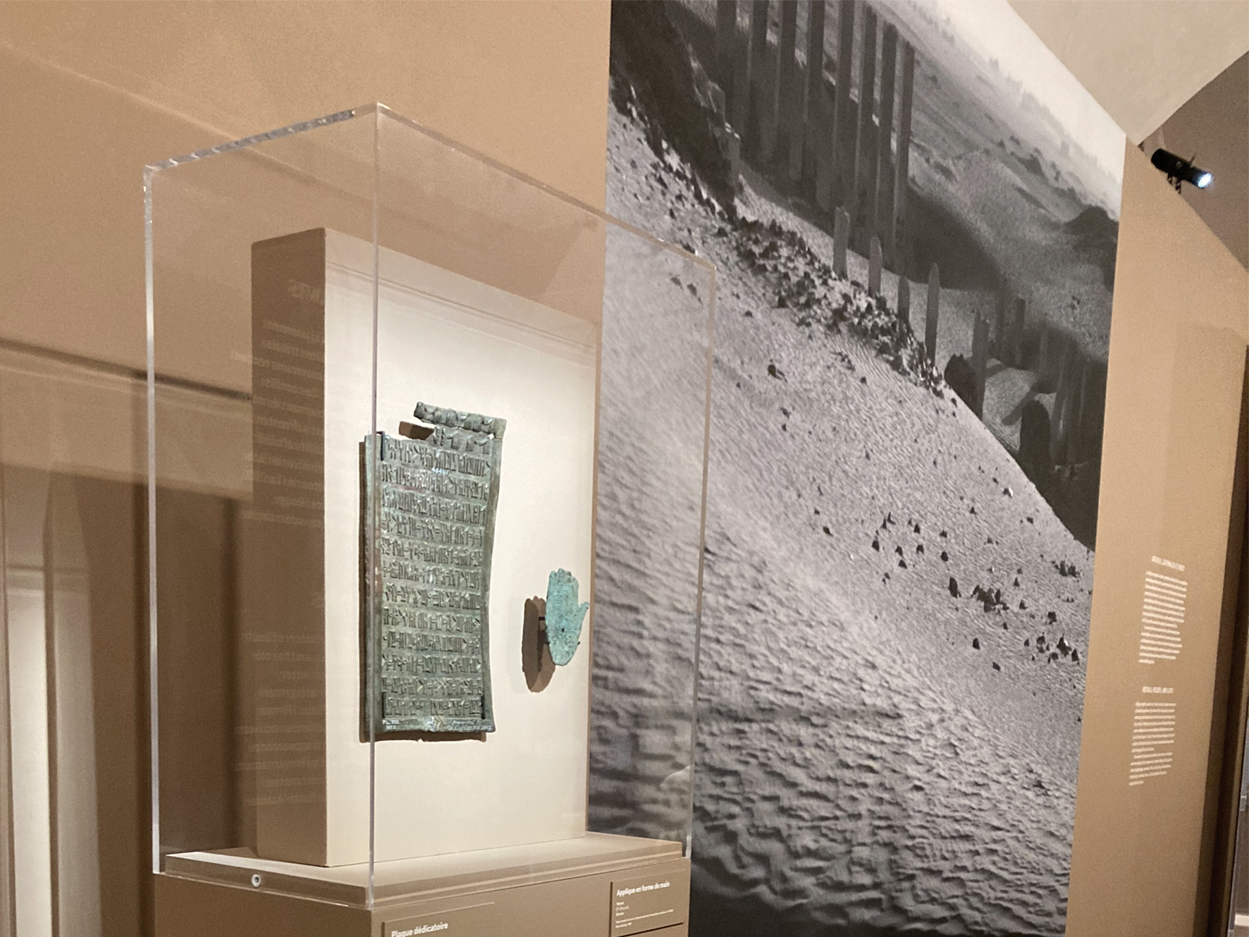 Des œuvres archéologiques témoignent « de la riche civilisation sud-arabique qui s’est développée entre le VIIIᵉ siècle avant et le VIᵉ siècle après Jésus-Christ, notamment la pièce majeure, un dossier de trône datant du VIIᵉ siècle avec une écriture en boustrophédon, qui est une dédicace au dieu du royaume de Saba, Almaqah », relate Ann Blanchet, conservatrice en chef du patrimoine au sein des musées de Marseille et commissaire de l’exposition.