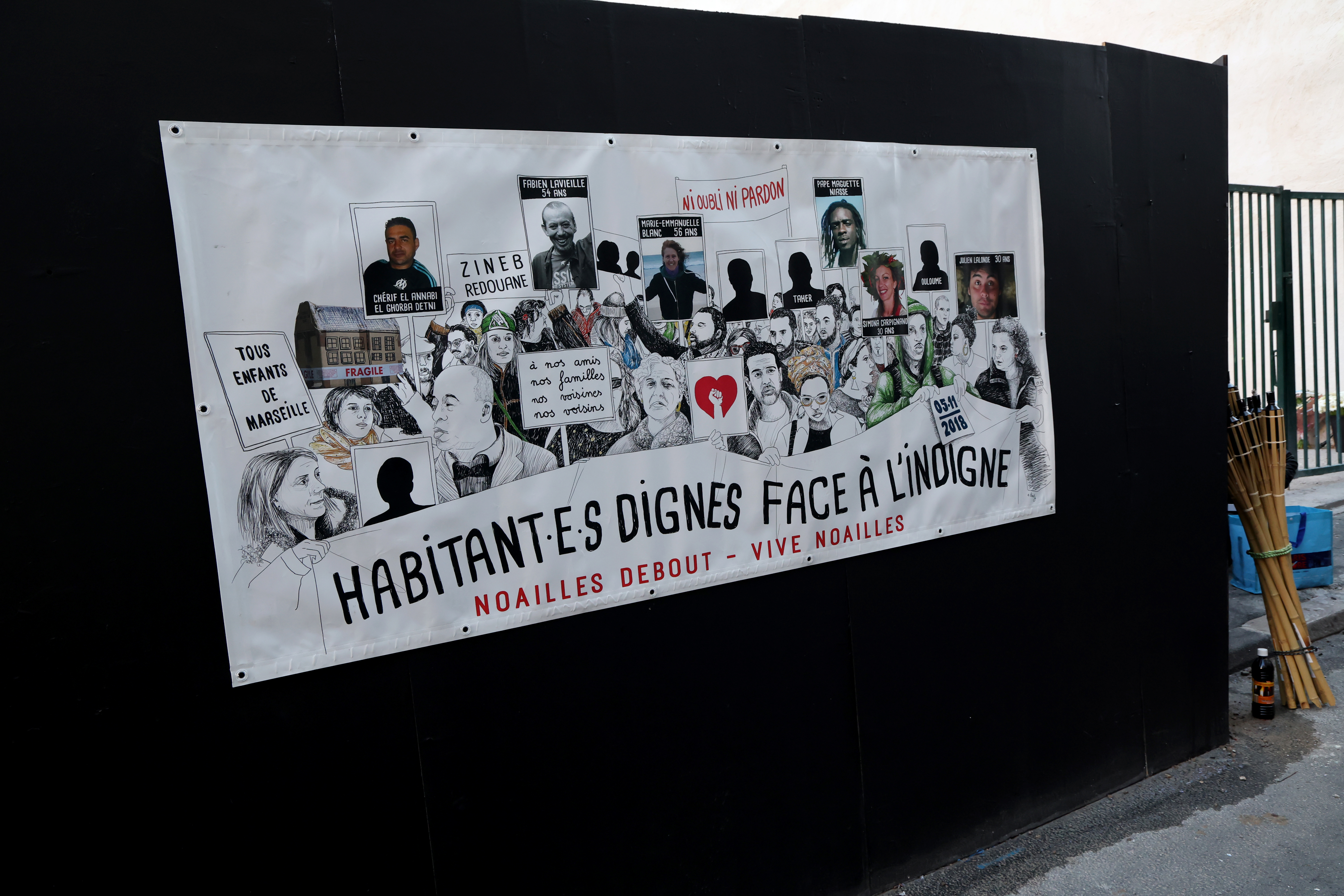 Les 8 victimes figurent sur la banderole installée devant la « dent creuse », où se trouvaient les 3 immeubles de la rue d’Aubagne. ©Alain Robert-Le Méridional